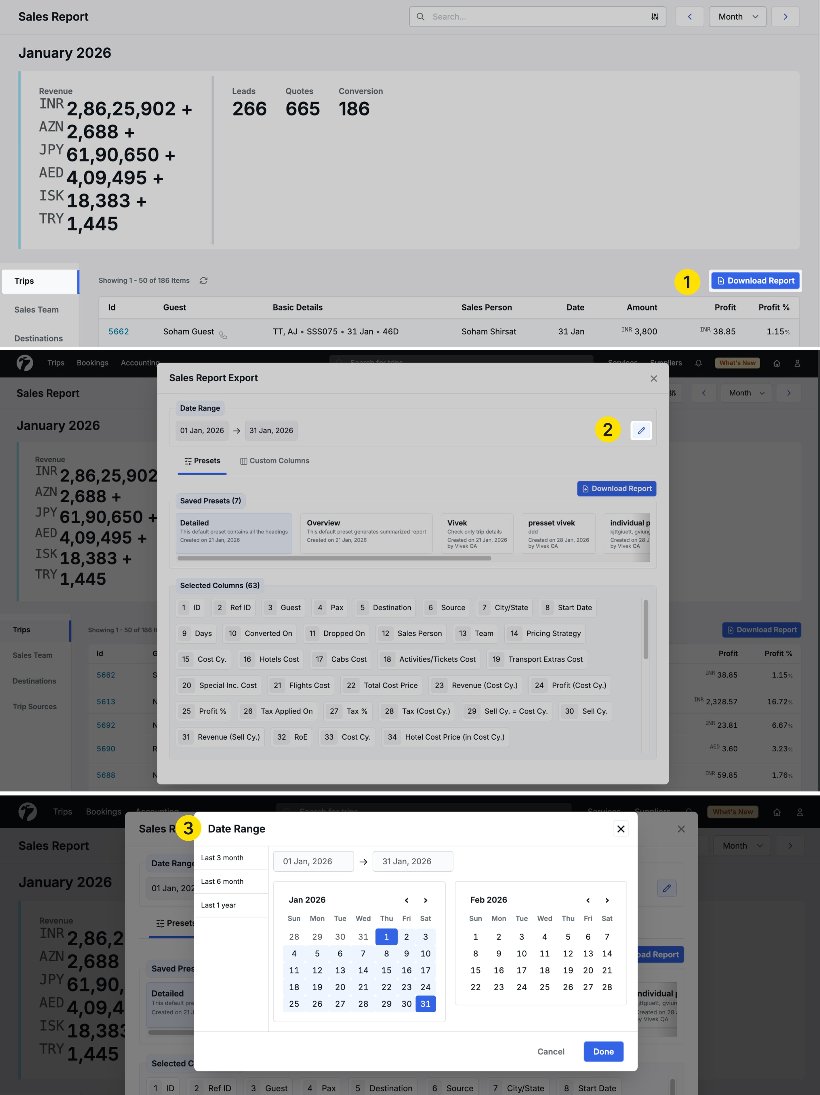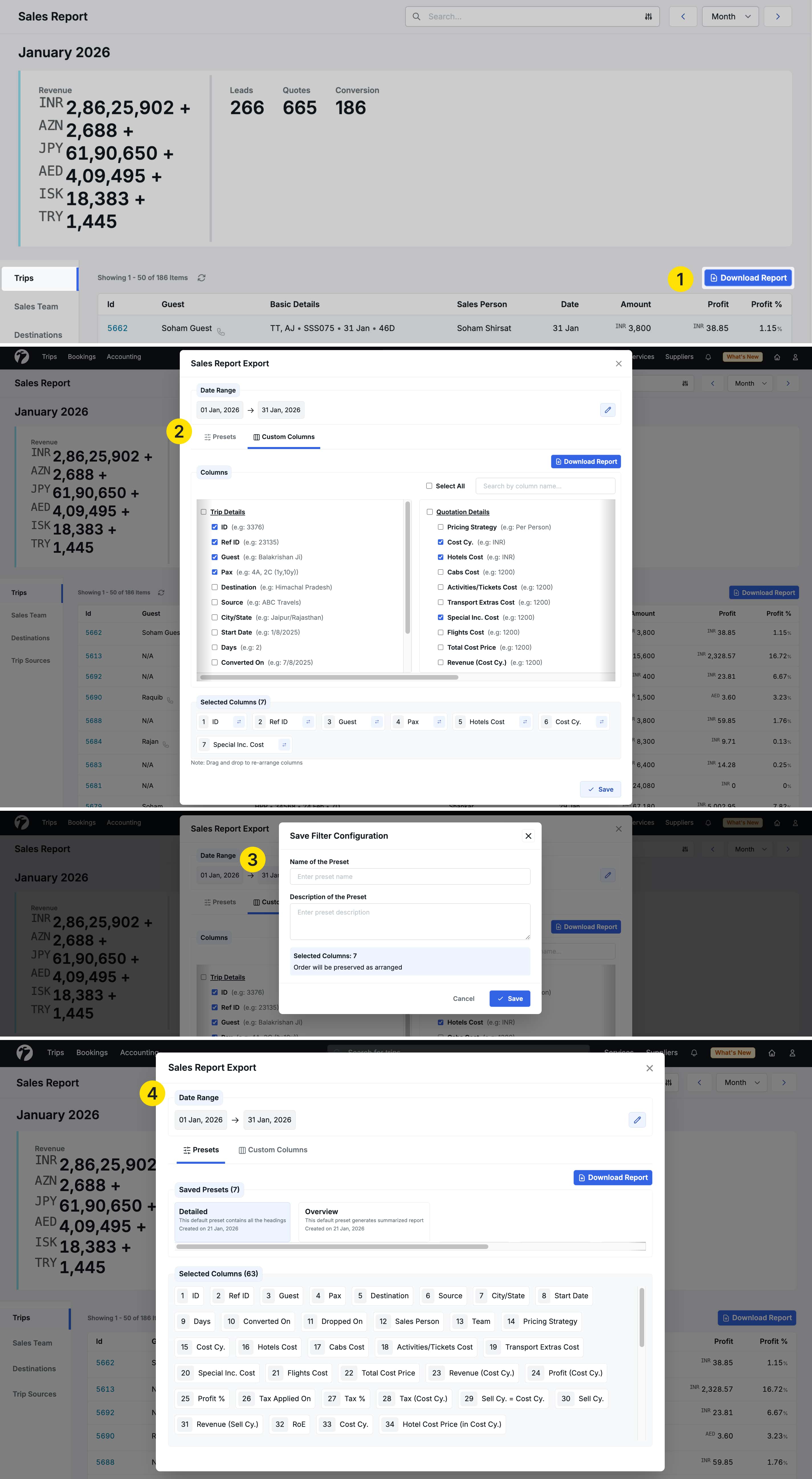 We have enhanced the Trip Sales Report with powerful customization options, allowing you to create custom column presets and download reports for extended date ranges.